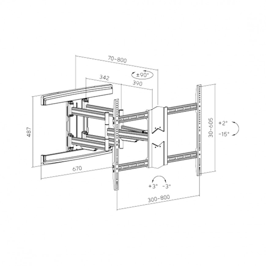 Кронштейн Brateck LPA57-686A Новый LPA57-686A изготовлен из высококачественной стали, которая обеспечивает долговечность. В нем могут устанавливаться телевизоры весом до 70 кг. Кроме того, он может наклоняться вверх и вниз от -2° до +15° и поворачиваться на 90° в любом горизонтальном направлении, чтобы найти оптимальное положение во время просмотра телевизора. Больше никаких бликов и напряжения глаз — он всегда будет в центре внимания в любом доме. Состав Цвет: Зернистый чёрный Рекомендуемые размеры экранов: 43 -100 дюймов Материал: Сталь Максимальная грузоподъемность: 70 кг Размеры Габариты готовых изделий после сборки (Д × Ш × В): 800 x 850 x 630 мм Совместимость с VESA: 300x200, 400x200, 300x300, 400x300, 400x400, 600x400, 800x400, 800x600 Диапазон наклона: +2°~-15° Диапазон поворота:+90°~-90° Профиль: 70~800mm Уровень экрана: +3°~-3°